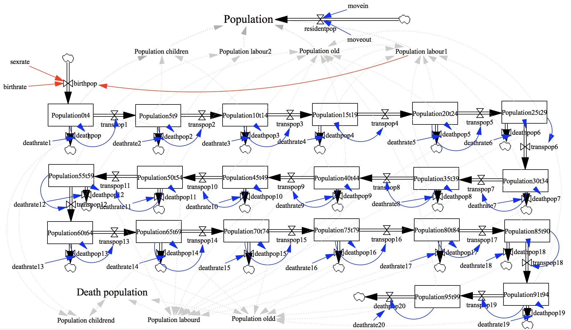 male<-read.xlsx("population simulation.xlsx",sheetName="male2",header=T,encoding='UTF-8',check.names = FALSE) female<-read.xlsx("population simulation.xlsx",sheetName="female2",header=T,encoding='UTF-8',check.names = FALSE) female<-female%>%gather(Year,Population,-1) male<-male%>%gather(Year,Population,-1) female$Population<-female$Population*-1 male$sex<-"male";female$sex<-"female" maoming<-rbind(male,female) maoming$Population <- round(maoming$Population) maoming$abs_pop <- abs(maoming$Population) maoming$agegroup<-factor(maoming$agegroup, levels=c("0-4","5-9","10-14","15-19","20-24","25-29","30-34","35-39","40-44","45-49", "50-54","55-59","60-64","65-69","70-74","75-79","80-84",'85-90','91-94','95-99'),order=T) m<-seq(2010,2035,by=1)