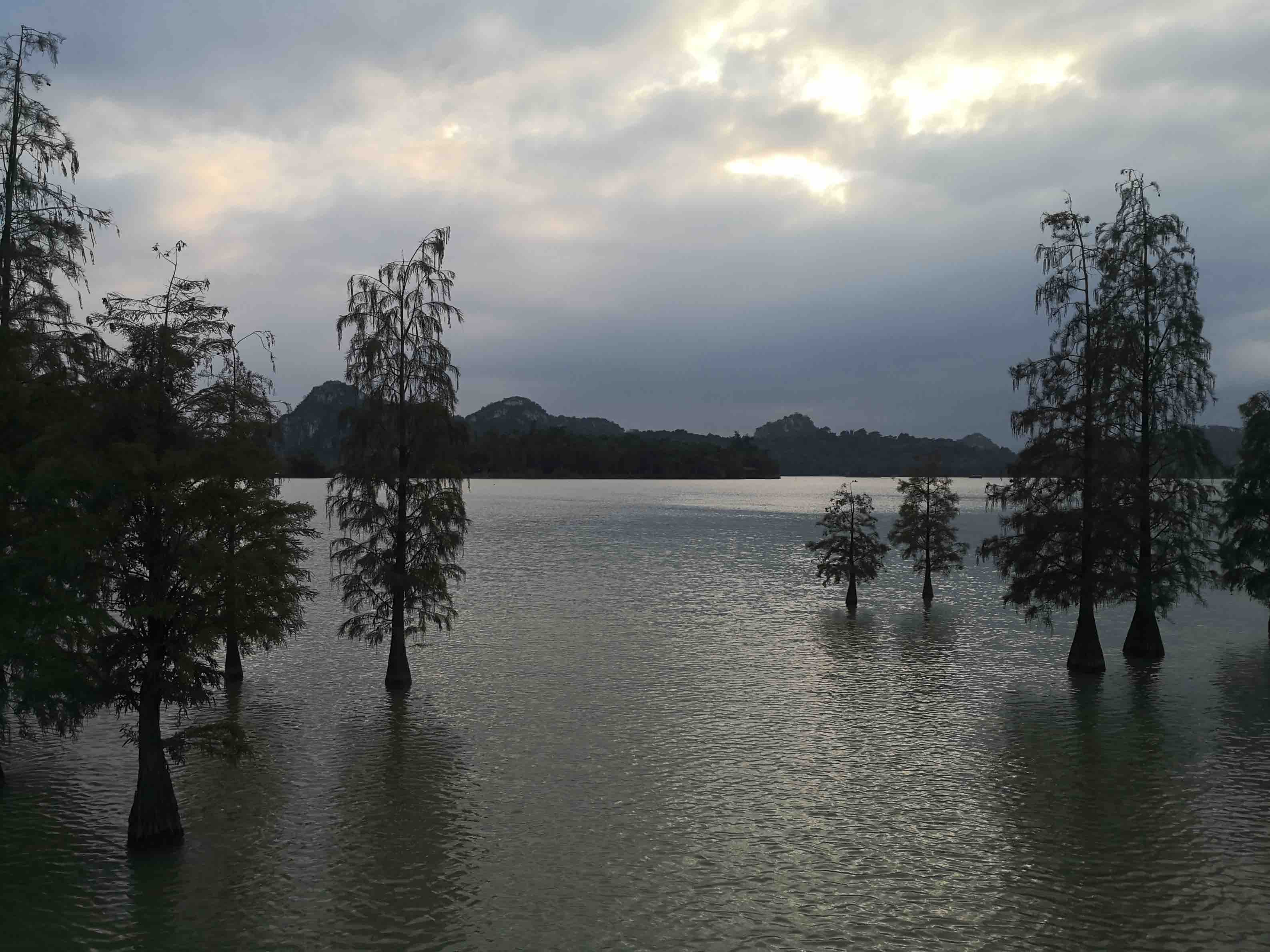 后乘船至东北岛屿,按四点四十分,游客售票处本不愿卖我了,好幸坐了最末班的船。船上没有其他游客,可自娱是包船出行了。到岛上,有火烈鸟、丹顶鹤观赏。又乘船至景区最东侧,上岸步行经出米洞,终至卧佛含丹处。