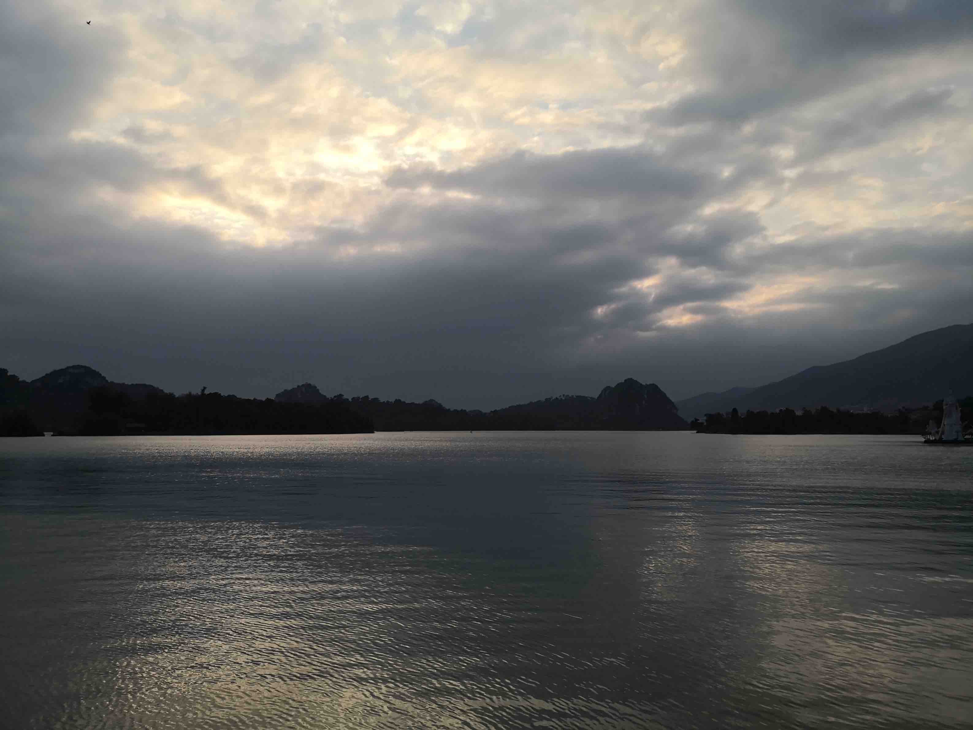 我在卧佛含丹处小坐了二十分钟。卧佛含丹的由来在于,因处北回归线,在春分、秋分时节,夕阳将在七星岩组成的群山睡佛口中缓缓落下。我以为景区山水视野最宜人处在此,虽天柱山顶的摘星亭视野更宽阔,但临水处更温柔。此时虽是十月,未见含丹景,但天朗气清,霞光并山水盈盈,仍是具有治愈性的、令人心折的。不同于博物馆中,文物背后的历史厚重所给予个体生命延长的感动,自然风光是此时此刻的耳闻之、目遇之的造物者之无尽藏,更进一步,黄庭坚说:”天下清景,不择贤愚而与之,然吾特疑端为我辈设。"在记忆深处,自然成就了人永恒的审美,山水大地哺育了人精神世界的丰盈、热烈与深刻。后从景区出来,回酒店取寄存行李,仍按原路返回。到学校是十点了。